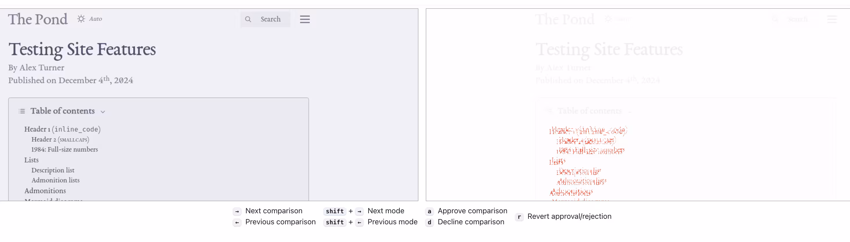 - When I take screenshots of site styling, they’re almost all of the test page content. The test page decouples site styling from updates to content around my site, ruling out alerts from “changed” screenshots which only show updated content.